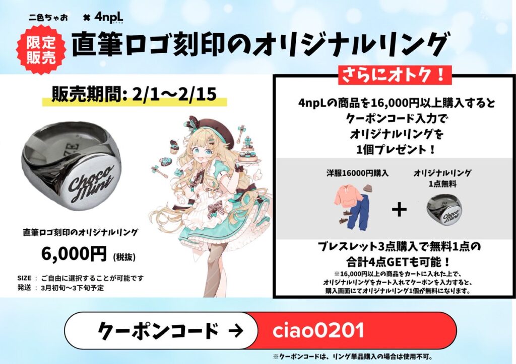 クーポンコード『ciao0201』を入力することでオリジナルリングが無料でついてきます!